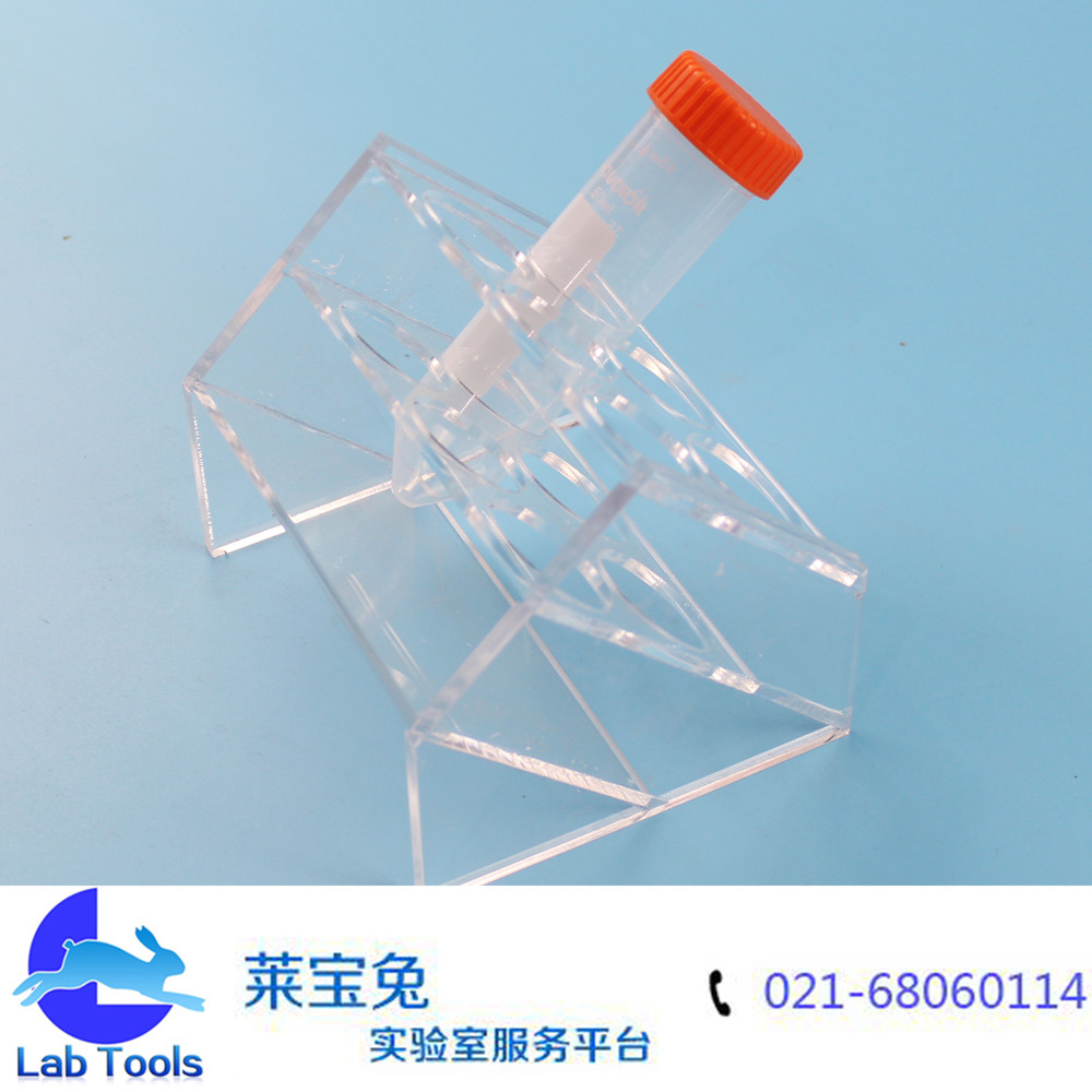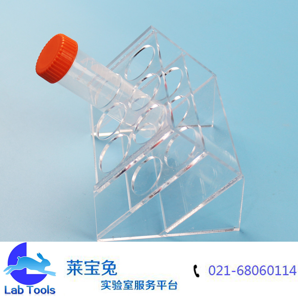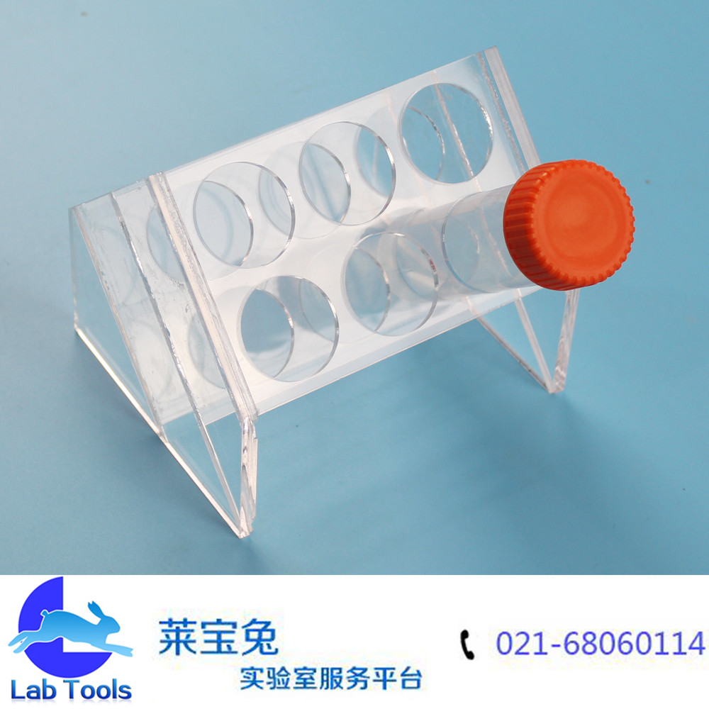 品名:斜型有机离心管架 规格:6孔(可定做其他孔数) 材质:有机玻璃 孔径:30mm 特点:斜型设计,可以放6个50ml离心管
