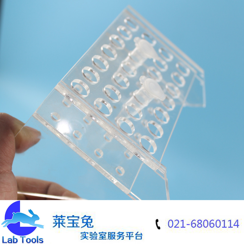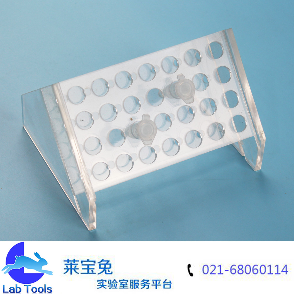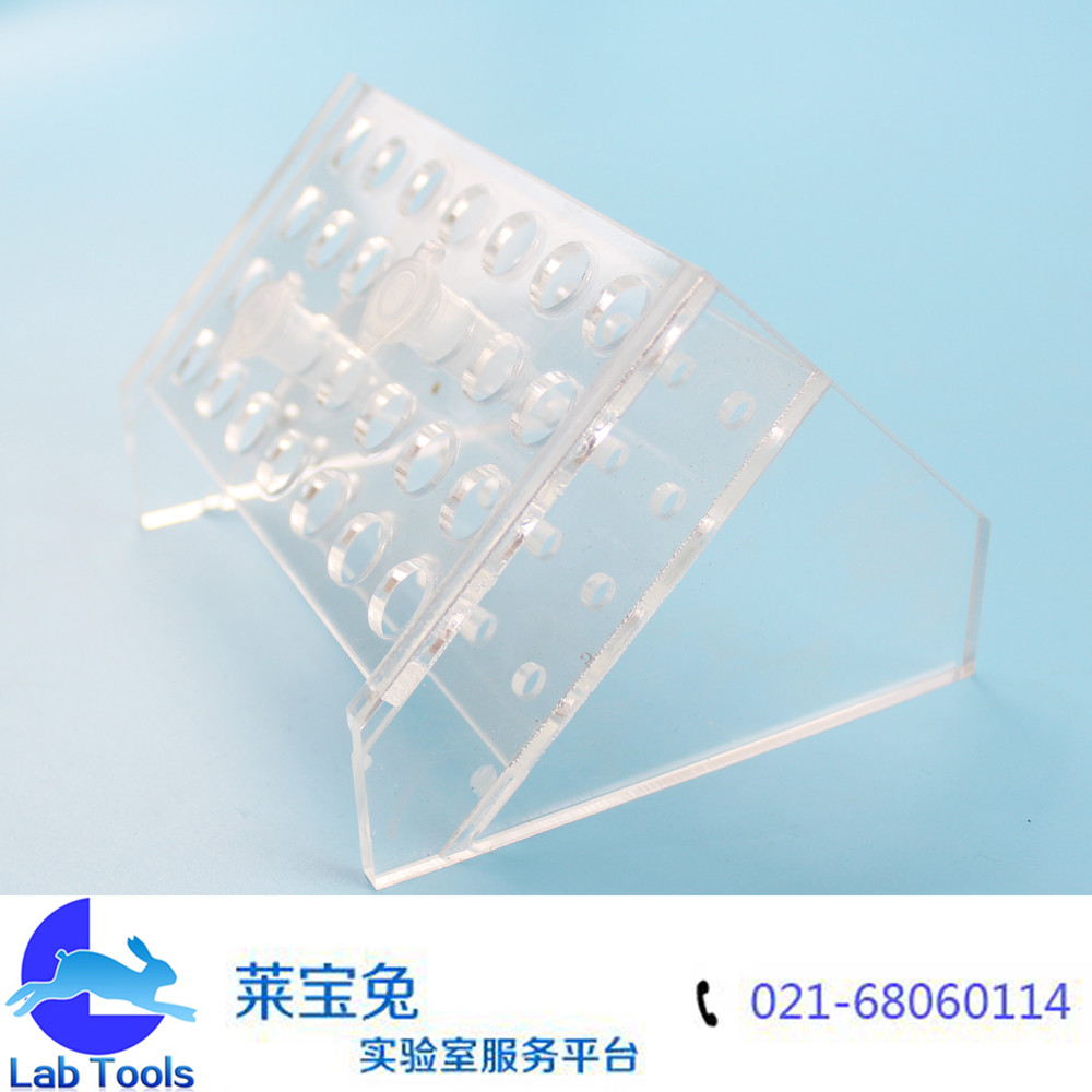 品名:斜型有机离心管架 材质:有机玻璃 规格:28孔,可放28个1.5ml或2ml离心管 需要其他规格可定制!