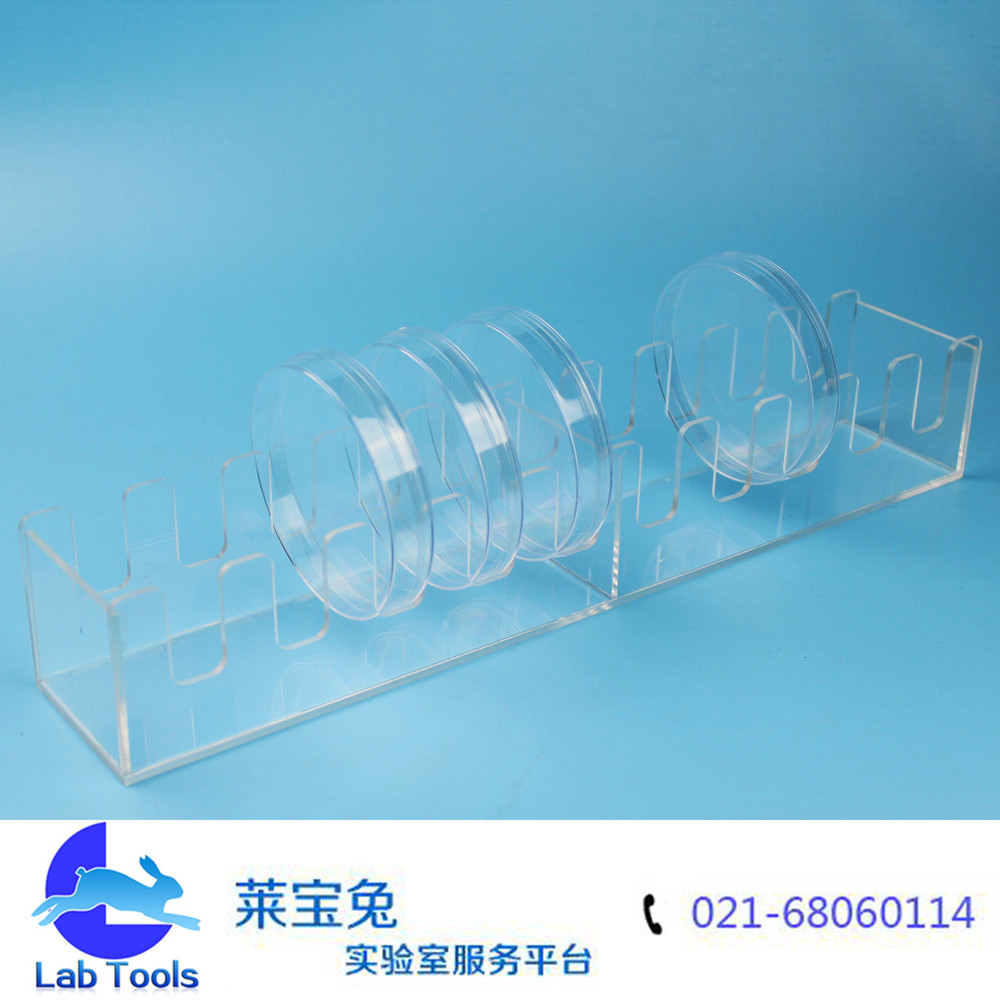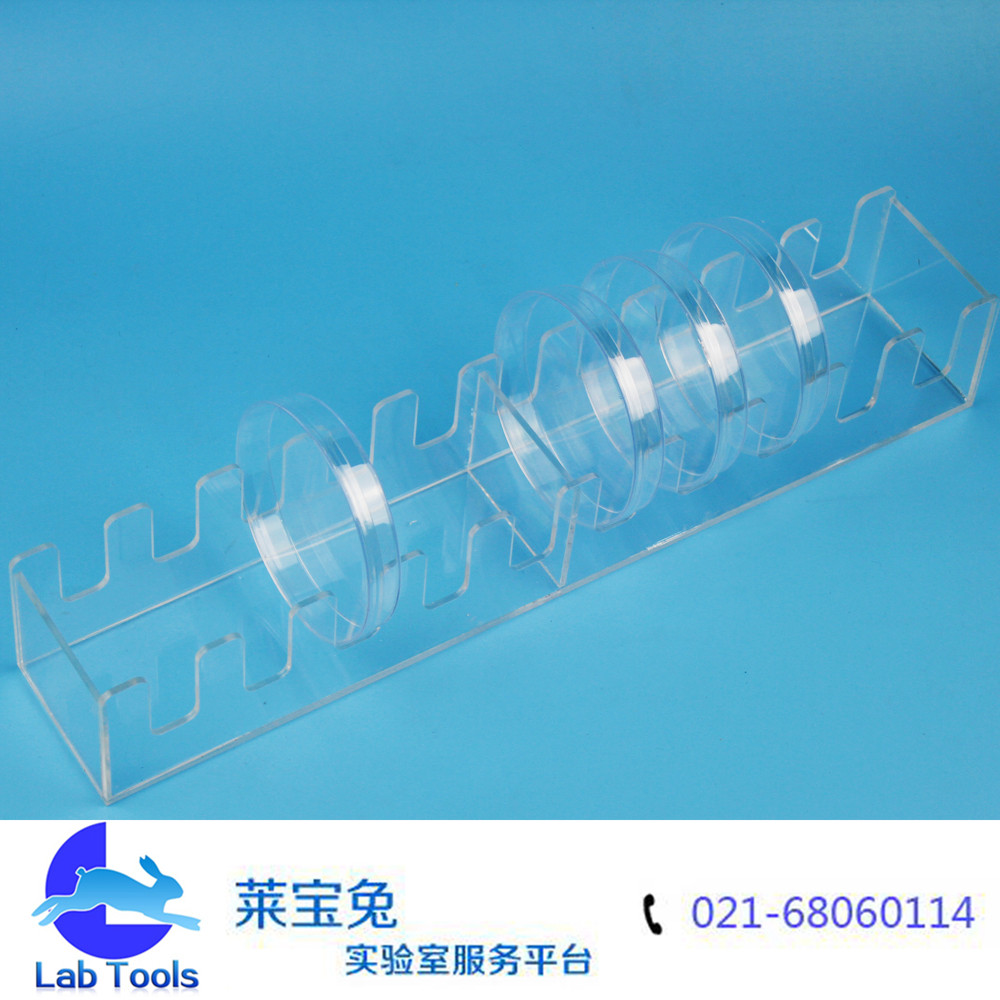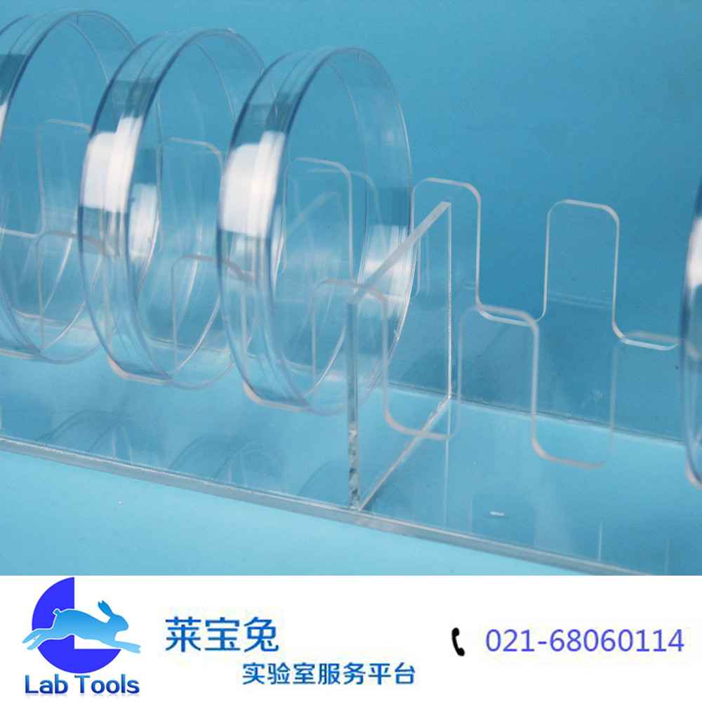 有机玻璃培养皿架 10个装 竖放 90塑料培养皿 孔距18mm 间距18mm 总长38厘米,宽6.8厘米,高6厘米 使用方便轻巧,可定做不同孔距和孔数,这款适用于常规的90mm塑料培养皿,玻璃的90培养皿会厚一些,因此孔距也要增大,就需要定做。因此在选购时先确定自己的培养皿的厚度是多少。